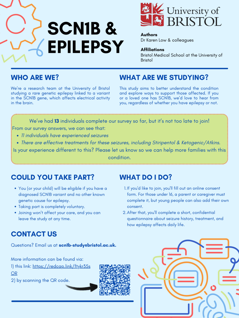 You can take part in this study if you (or your child) have a diagnosed SCN1B variant without another known cause for your epilepsy (such as an additional gene variant). We are particularly interested in the SCN1B C121W variant.